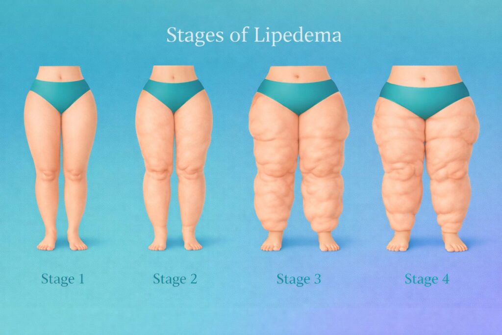 Lipedema is a chronic and often painful fat distribution disorder that primarily affects women. It is frequently misdiagnosed as obesity or lymphedema. Early identification is essential to slow disease progression and improve quality of life. The stages below describe how lipedema typically presents in the lower body.